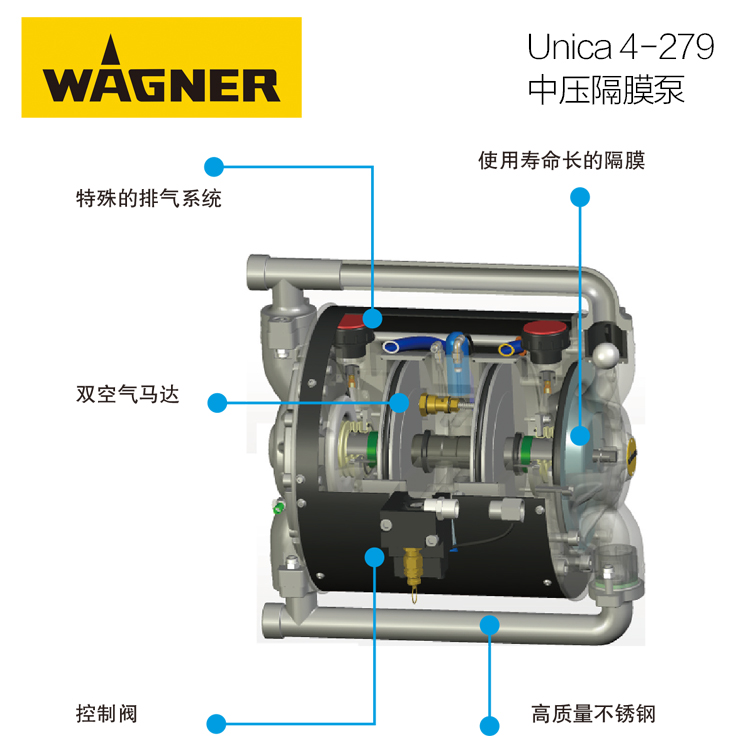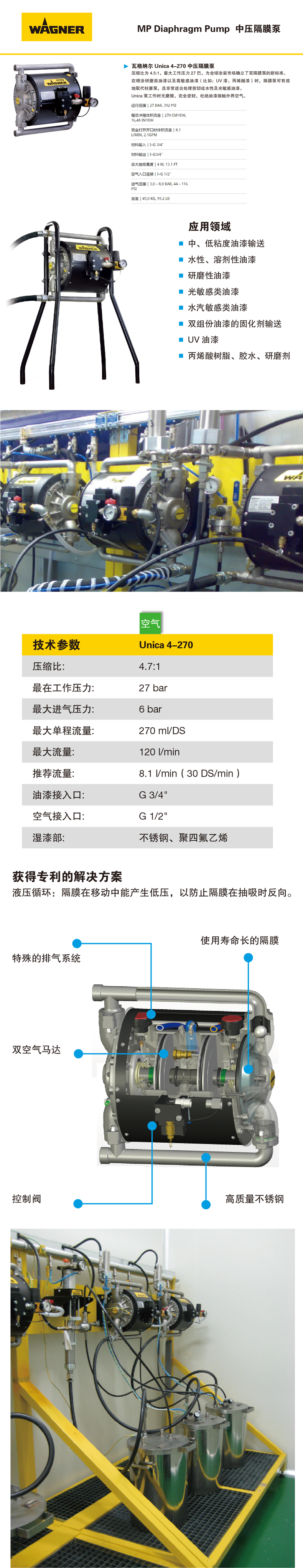 壓縮比為 4.5:1,最大工作壓力 27 巴,為全球涂裝市場(chǎng)確立了雙隔膜泵的新標(biāo)準(zhǔn)。 在噴涂研磨類油漆以及高敏感油漆(比如:UV 漆、丙烯酸漆)時(shí),隔膜泵可有效 地取代柱塞泵,且非常適合處理剪切或水性及光敏感油漆。 Unica 泵工作時(shí)無(wú)磨擦,完全密封,杜絕油漆接觸外界空氣。