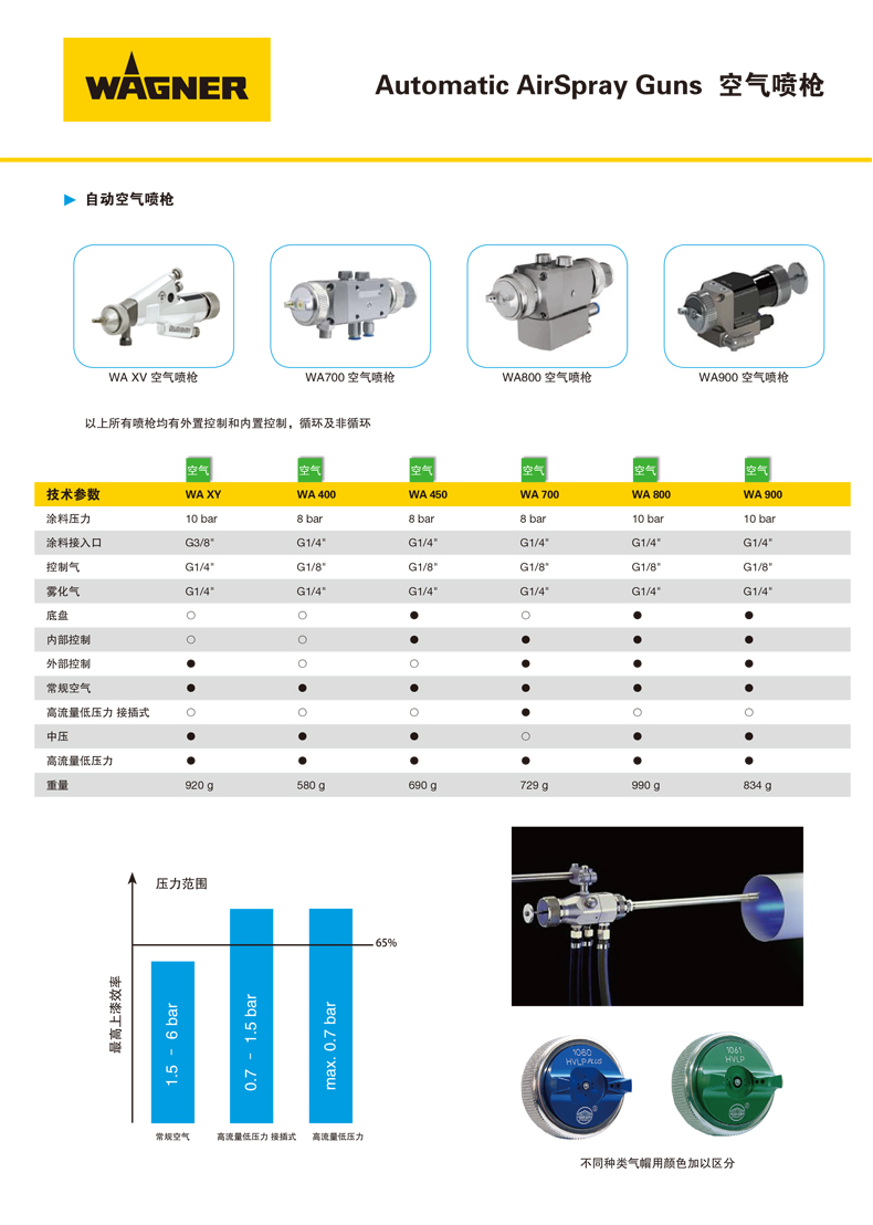 由于采用了最新開(kāi)發(fā)的HVLPPlus噴嘴空氣頭系統(tǒng),PILOT WA 700系列新型自動(dòng)噴槍可提供一流的噴涂效果,且材料消耗低。根據(jù)生產(chǎn)要求,可提供帶或不帶內(nèi)部控制的噴槍型號(hào)。